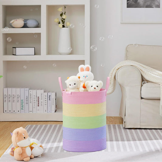 VIPOSCO Tall Laundry Basket, Large Dirty Clothes Hamper with Leather Handle, Woven Rope Storage Basket for Blanket, Toy In Living Room, Bathroom, Bedroom - 72L Rainbow