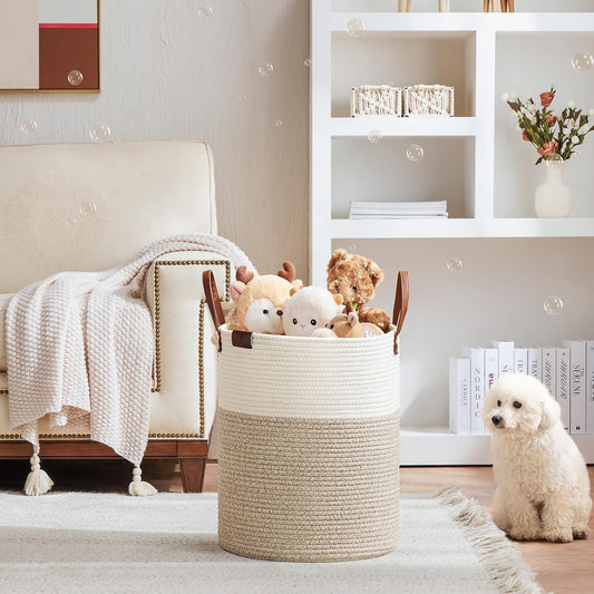 VIPOSCO Tall Laundry Basket, Large Dirty Clothes Hamper with Leather Handle, Woven Rope Storage Basket for Blanket, Toy In Living Room, Bathroom, Bedroom - 72L Brown & White