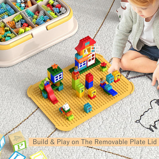 Toy Storage Organizer Box with Handle, Stackable Building Block Toy Box with Building Plate Lid & Removable Sorting Trays, Cubby Bins and Containers 2 Layer (Lemon)