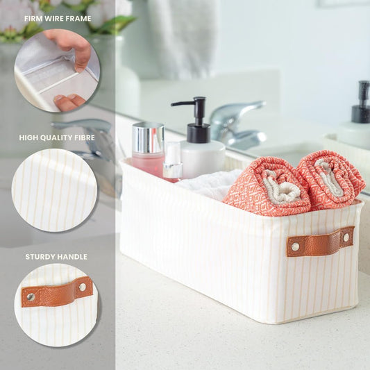 OrganiHaus Narrow Storage Bins 15x06in, Small Closet Bins for Shelves, Bathroom Storage Baskets, Narrow Baskets, Fabric Organizer with Handles, Toilet Paper Organizer - 2 Pack, White w/ Brown Stripes
