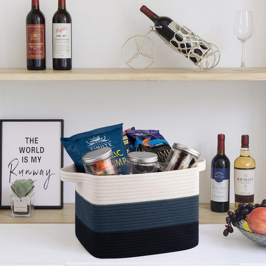 Small Storage Baskets for Organizing | Closet Organizer Bins | Shelf Toy Basket | Woven Rope Baskets | Cube Decorative Box | Shallow Basket | 13x8.5x5.1” | 3 Packs Navy Blue