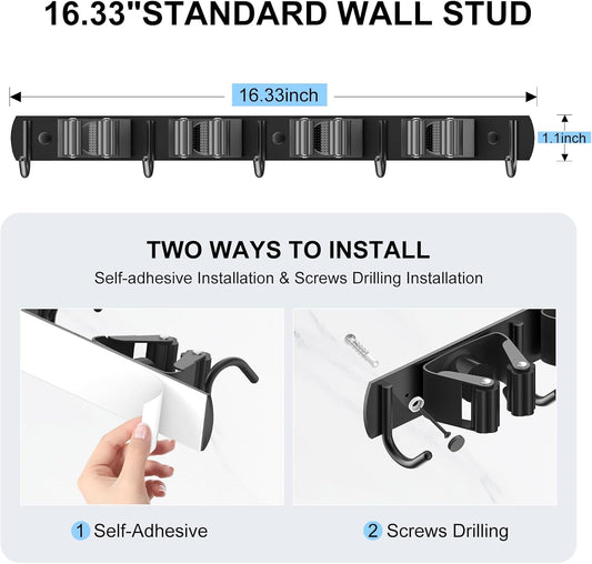 Wall-Mounted Cleaning Tool Organizer, 16.14x4.33x3.74 inches, Black Storage Rack with Drip Tray, Mop Holder with 5 Hooks