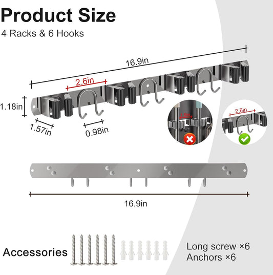Mop Broom Holder Wall Mount, Silver Stainless Steel Tool Storage Organizer for Kitchen Garden Garage Laundry Room Bathroom and RV with 4 Slots 6 Hooks
