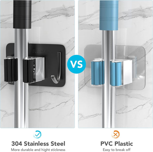 Mop Broom Holder No Drill, Mop Broom Organizer Wall Mounted Heavy Duty with Hooks Hanger, Self Adhesive Stainless Steel 4Pcs for Bathroom, Kitchen, Office (Black)