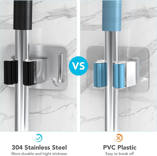 Mop Broom Holder No Drill, Mop Broom Organizer Wall Mounted Heavy Duty with Hooks Hanger, Self Adhesive Stainless Steel 4Pcs for Bathroom, Kitchen, Office (Multicolor)