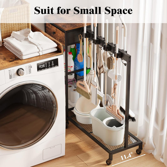 Heavy Duty Metal Cleaning Cart with Wheels,Broom Holder with Cleaning Supplies Organizer,Broom Storage Cart with Mop Hanger Gripper Rack Hooks for Home, Commercial (Rustic Brown, 37.6" L)