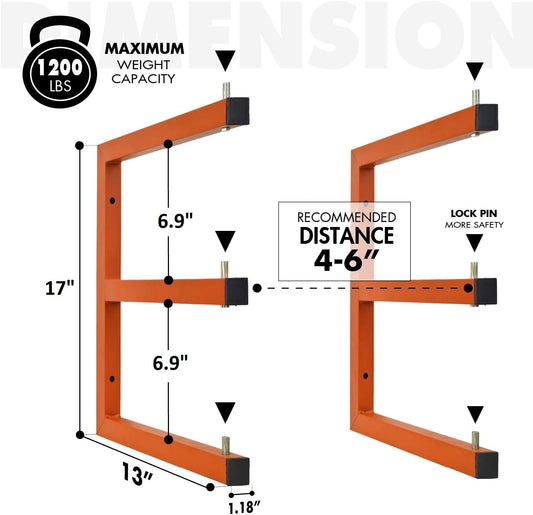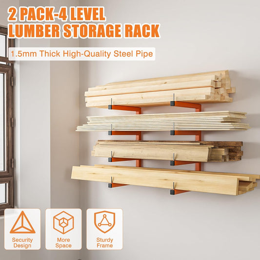 2-Pack Lumber Storage Rack, Wood Storage Racks Wall Mount, Heavy Duty Garage Wood Organizer With 4-Level System, Orange Utility Rack Organization Up 800 Lbs, Metal Lumber Shelf for Indoor and Outdoor