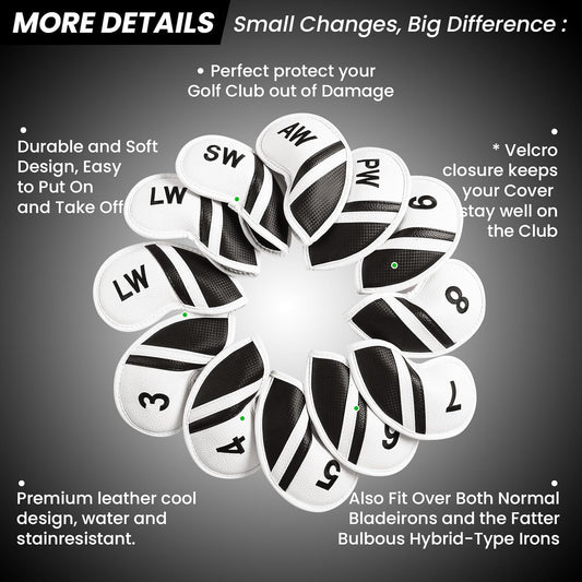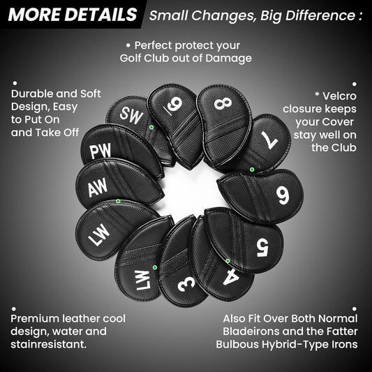 Golf Iron Head Covers (12-Pack) Synthetic Leather Waterproof Club Head Covers for Standard Irons – Magic Tape Closure, Universal Fit & Anti-Loss Design