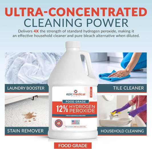 12% Food Grade Hydrogen Peroxide – Ultra-Concentrated H2O2 Peroxide Cleaner – 1 Gallon Bottle – Bleach Alternative for Household Cleaning, Laundry, Glass & More – Made in USA (1)