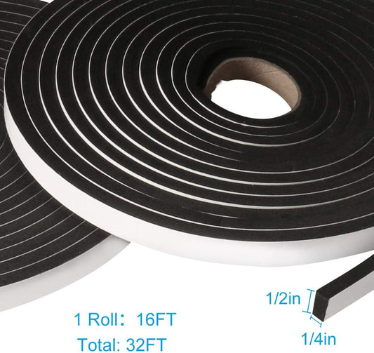 2 Rolls Foam Tape Weatheratrip for Door Window Insulation, Single Sided Foam Strips Adhesive, High Density Foam Seal Tape, Closed Cell Foam Seal Strip Tape(1/2"Wx1/4"Tx32FT, Black)