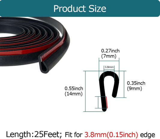 Rubber Edge Trim Black, U Channel Rubber Seal Strip with Self-Adhesive Tape, Metal Edge Protector Fit for 0.15", 25Ft