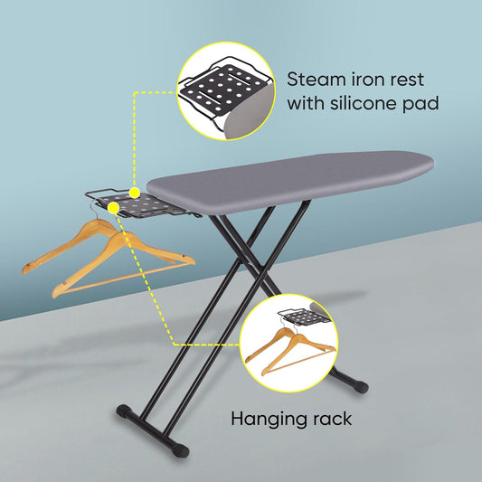 Deluxe Ironing Board with Heat Resistant Cover and Thicken Felt Pad, Heavy Sturdy Legs,Full Size Hanger Iron Board,Foldable (L-Grey)