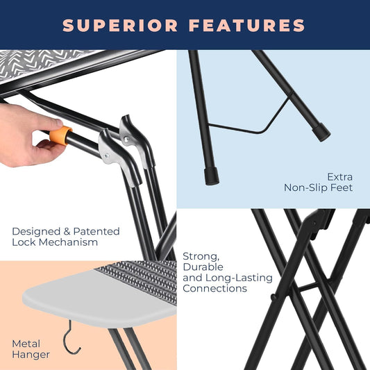 Happhom Ironing Board, Compact and Space Saver Iron Board, Safety Ironing with Park Zone and 4 Layers Extra Thick Cover, Patented Lock System for Foldable Leg, Easy Storage with Smart Hanger (13x43)