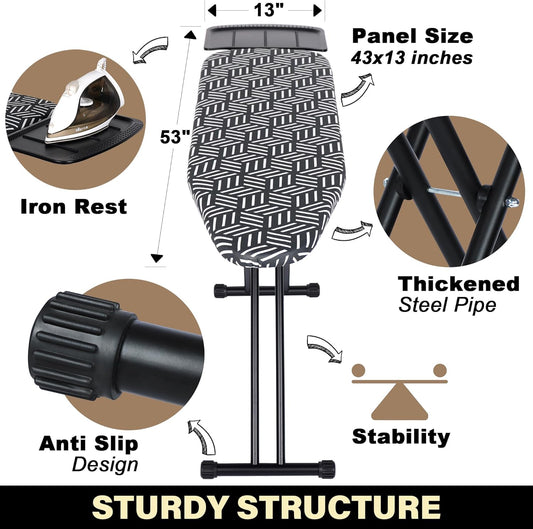 Ironing Board 43x13, Compact Iron Board Full Size with Heavy Duty Iron Rest, Thick Padded Cover, Adjustable Height, Sturdy Lightweight Steel Legs, Black