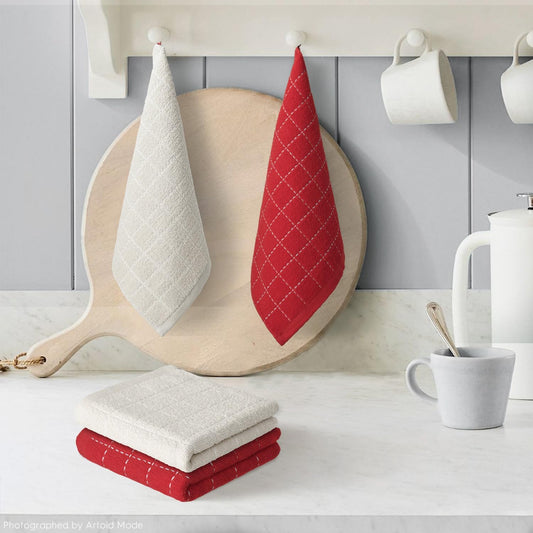 Artoid Mode Checkered Designed Cotton Beige Red Terry Kitchen Dish Cloths, 12x12 Inch Soft Absorbent Quick Drying Cleaning Kitchen Rags Set of 6