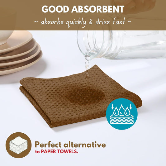 Native Fab Waffle Weave Dish Towels 12 Pack 100% Cotton, 16x26 Inches, Super Absorbent, Quick Dry, Waffle Knit Dishcloths with Hanging Loop, Washable for Kitchen Cleaning, Drying Dishes, Brown