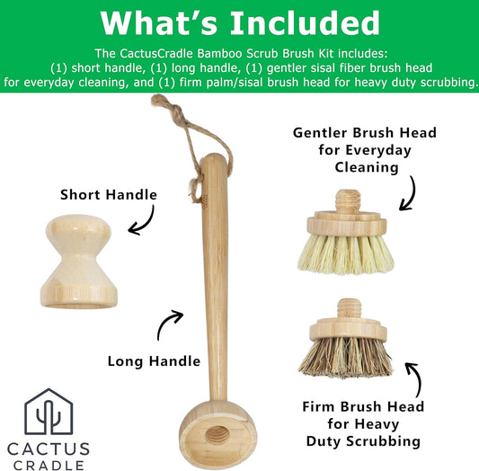 Cactus Cradle Bamboo Scrub Brush Kit – 4-Piece Dish Brush Set with 2 Handles & 2 Interchangeable Heads | Plastic-Free, Non-Toxic, Non-Scratch Cleaning for Dishes, Pots, Pans & Produce