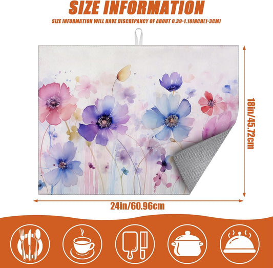 Watercolor Flowers Dish Drying Mat for Kitchen Counter Microfiber Absorbent Dish Kitchen Drying Mat Draining Reusable Washable for Dishes/Utensils/Counterto