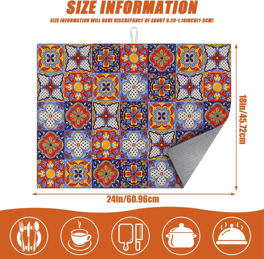 Talavera Mexican Tiles Dish Drying Mat for Kitchen Counter Microfiber Absorbent Dish Kitchen Drying Mat Draining Reusable Washable for Dishes/Utensils/Counterto