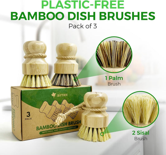Bamboo Dish Brush Set of 3-100% Plastic Free Kitchen Scrubber with Medium Stiff Sisal and Strong Blend of Coconut Bristles - Non Scratch, Odor Free Wood Scrub for Pots, Pans and Vegetables