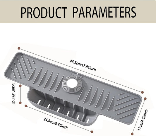 Silicone Faucet Mat with Sponge Holder, Sink Splash Guard, Faucet Draining Mat for Kitchen Bathroom, 5° Slope Split-flow Drainage, Sink Dry and Tidy Organizer, Gray
