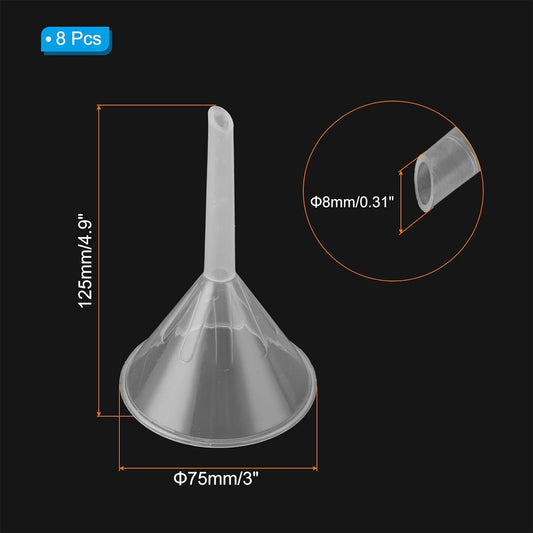 PATIKIL 3 Inch Clear Plastic Funnel, 8 Pcs Wide Mouth Multipurpose Transfer Funnel with Long Spout for Filling Water Bottle Liquid Lab Spices Powder Oil