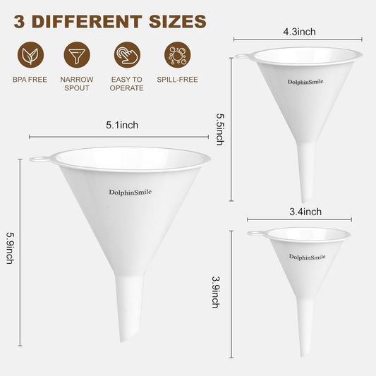 Plastic Kitchen Funnel Set of 3, Round Kitchen Funnels for Filling Bottles, Durable and Multifunctional Funnels for Filling Canning, Cooking, Lab or Car Oil (White)