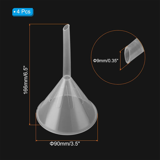 PATIKIL 3.5 Inch Clear Plastic Funnel, 4 Pcs Wide Mouth Multipurpose Transfer Funnel with Long Spout for Filling Water Bottle Liquid Lab Spices Powder Oil
