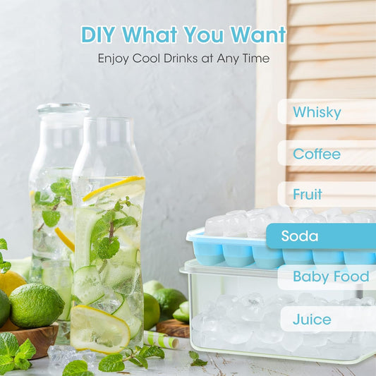 DOQAUS Ice Cube Tray with Lid and Bin, 4 Pack Silicone Plastic Ice Cubes Trays for Freezer with Box/Container, Stackable with Storage Iced Bucket Kits, Scoop, for RV, Soup, Food, Cocktail, Coffee