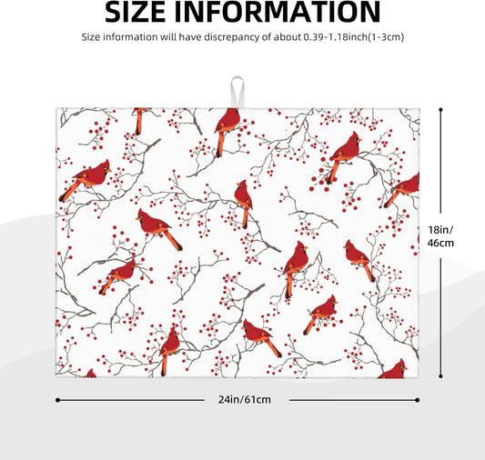 Cardinal Bird Red Berry Decor Microfiber Dish Drying Mat for Kitchen Counter Cute Dishes Pad Dish Drainer Rack Mats 18"x24" Absorbent Washable Reusable Home Holiday Decor