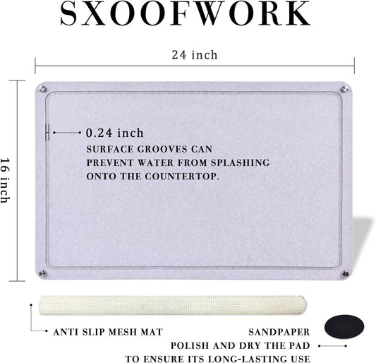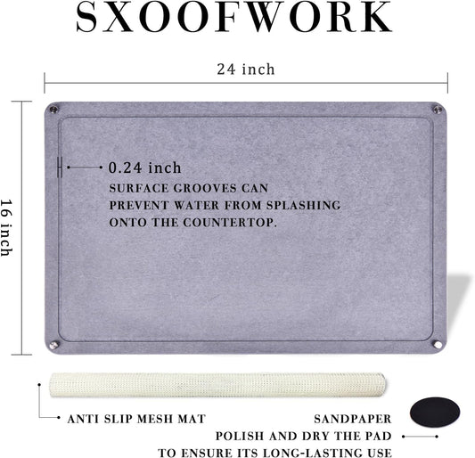 Large Diatomaceous Earth Stone Dish Drying Mats for Kitchen Counter,24"×16",Quick Drying,with 4 Non-Slip Stainless Steel Feet, Suitable for Various Countertops, Bowl Racks, Medium Gray