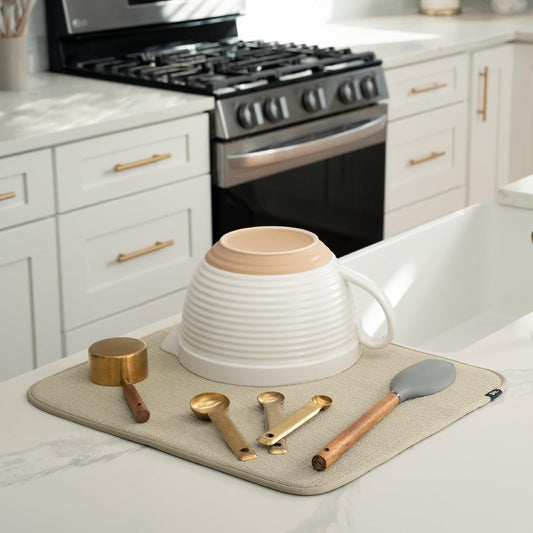 S&T INC. Dish Drying Mat, 16” x 18”, Absorbent Microfiber Kitchen Counter Mat, Dish Drying Pad for Dishes, Utensils, Pots and Pans, Large, Cream Distressed Lines