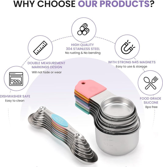 Magnetic Measuring Cups and Spoons Set-Heavy Duty 304 Stainless Steel,Double Measurement Markings,Set of 16 with Leveler for Measure Dry and Liquid Ingredients