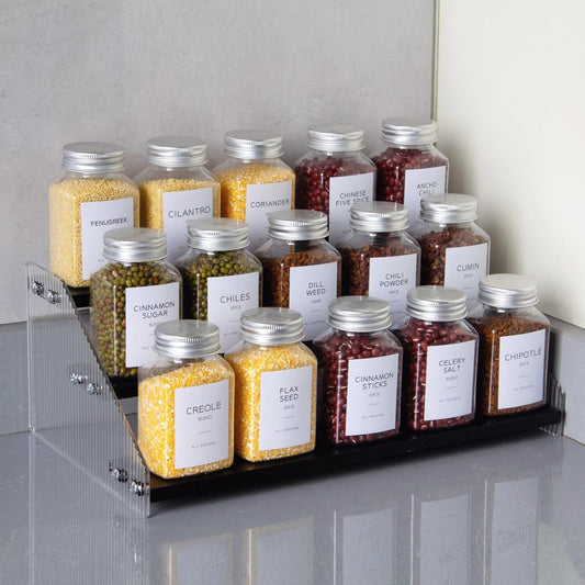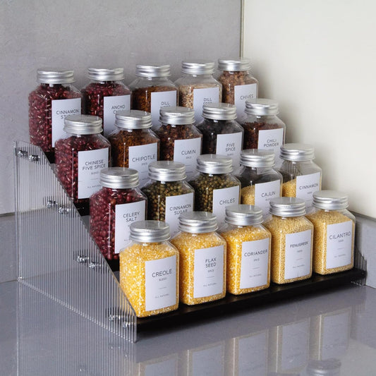 nianfeng Tiered Spice Rack, 4-Tier Spice Pantry Kitchen Cabinet Organizer, 12-Inch, Natural Wood Acrylic Stair Riser Stand, Countertop Seasoning Shelf (Black)