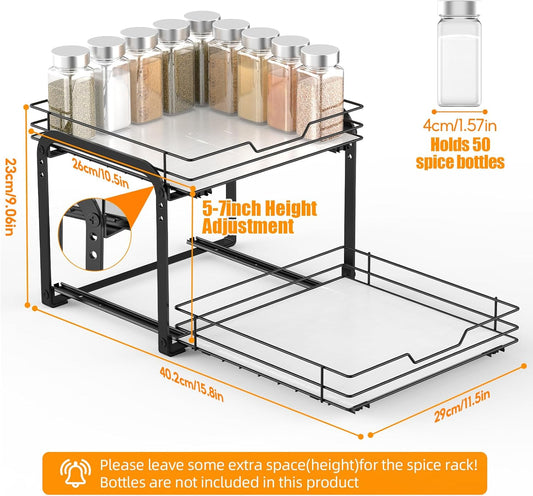 Spice Rack Organizer for Cabinet, 2 Tier Pull Out Spice Rack – Heavy Duty Metal Spice Organization for Cabinet, 50-Jar Capacity, Height Adjustable Cabinet Organizer (11.5W" X 10.5"D X 9"H, Black)
