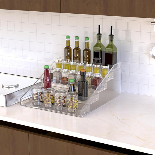 PMMASTO Widen Tiered Spice Rack, Seasoning Organizer, Clear Acrylic Vertical Shelves Can Organizer for Countertop, Cabinet, Pantry, Kitchen Organization and Storage - 3 Tier