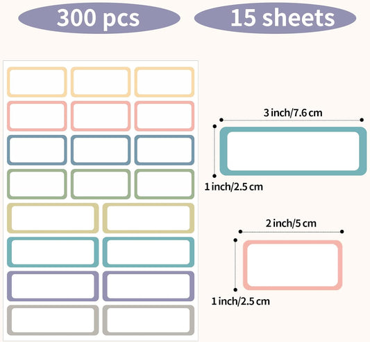 Removable Colored Labels Stickers, Self-Adhesive Rectangular Stickers Star Border Water/Oil/Tear Resistant for Storage/Classroom/Home (2 Size, 300 Labels)