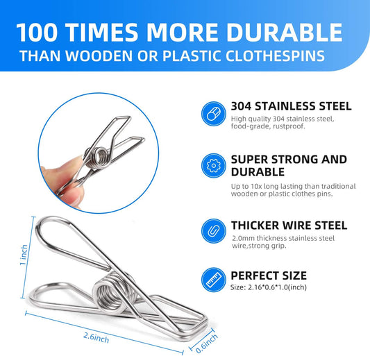 100 Pack Metal Clothes Pegs, Stainless Steel Utility Clips for Laundry, Washing Line, Snack Bags, Paper Files