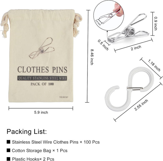 100 Pcs Clothespins Laundry Chip Clips - Durable Stainless Steel Clothes Pins,Heavy Duty Clamp Metal Wire Clothes Pegs with One Storage Bag & 2 Hooks,for Outdoor Clothesline Home Kitchen Office