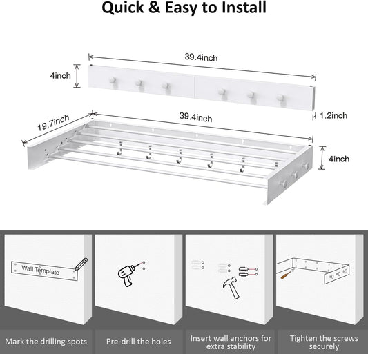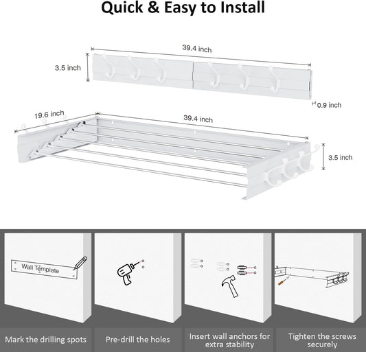 Laundry Drying Rack, Collapsible Wall Mounted Clothes Drying Rack - Foldable,Space Saving, 13.2 Linear Ft, 5 Aluminum Rods, 60 lb Capacity (White, 40")