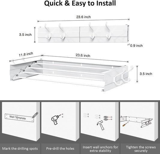 Laundry Drying Rack, Collapsible Wall Mounted Clothes Drying Rack - Foldable,Space Saving, 13.2 Linear Ft, 4 Aluminum Rods, 60 lb Capacity (White, 23.6" Wide)