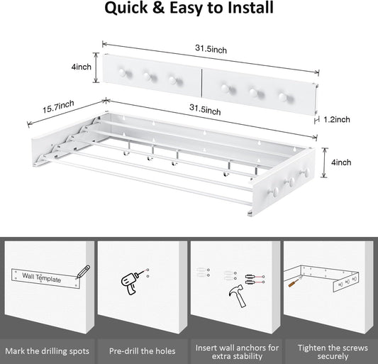 Laundry Drying Rack, Collapsible Wall Mounted Clothes Drying Rack - Foldable,Space Saving, 13.2 Linear Ft, 5 Aluminum Rods, 60 lb Capacity (White, 31.5)