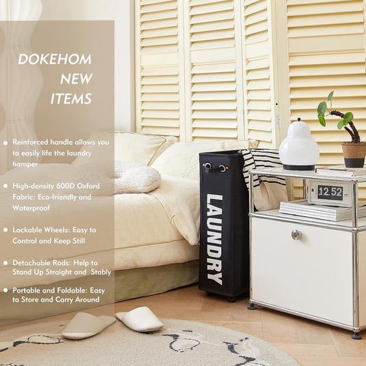 DOKEHOM 25-Inches Slim Laundry Basket on Wheels, Collapsible Rolling Laundry Hamper, Foldable Narrow Corner Clothes Storage Bins (Black)