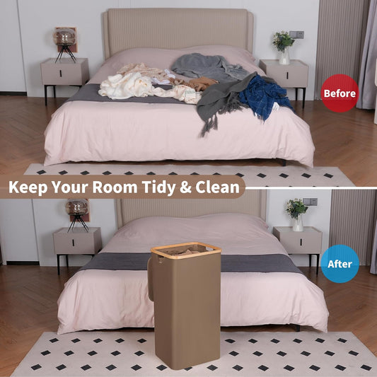 26 Gal Laundry Basket with Lid and Net Bag, Tall Laundry Hamper with Bamboo Handles, Aesthetic Dirty Clothes Bin for Laundry Room, Bathroom, Bedroom and Dorm, Brown