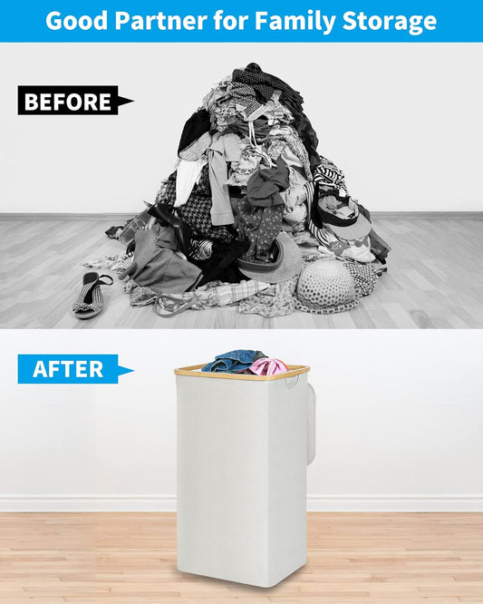efluky Laundry Hamper with Lid, 100L Tall Laundry Basket with Bamboo Handles for Clothes and Toys, Collapsible Laundry Hamper with Inner Bag for Bedroom and Bathroom, White