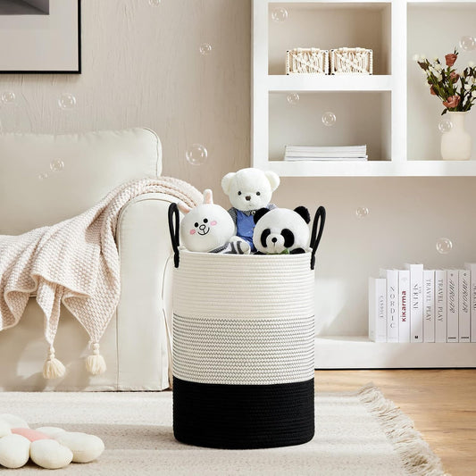 VIPOSCO Large Laundry Hamper, Tall Woven Rope Storage Basket for Blanket, Toys, Dirty Clothes in Living Room, Bathroom, Bedroom - 58L White & Black