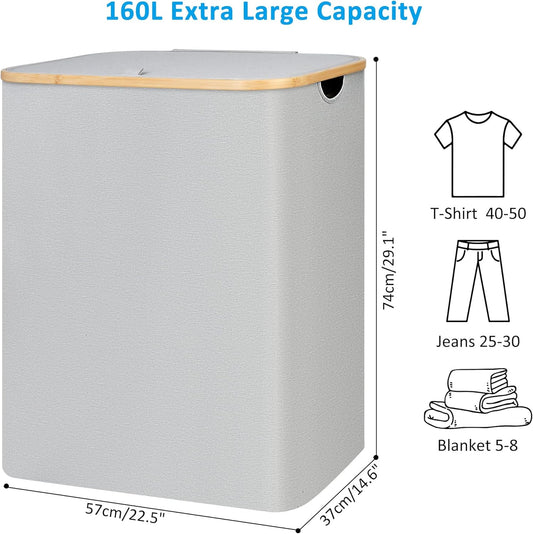 efluky Laundry Hamper with Lid, 160L Tall Laundry Basket with Bamboo Handles for Clothes and Toys, Collapsible Laundry Hamper with 2 Inner Bags for Bedroom and Bathroom, Beige