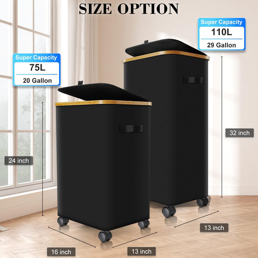 Laundry Hamper with Wheels,29 Gal (110L) Laundry Basket with lid Rolling Clothes Hamper Foldable Dirty Clothes Basket on wheels with Bamboo Frame and Bag for Bedroom, Dorm, Laundry Room-Black