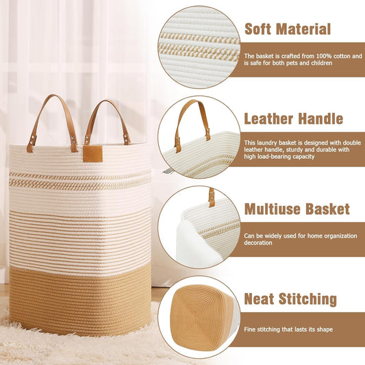 danpinera Large Laundry Hamper – 75L Tall Woven Cotton Storage Basket with Leather Handles, Slim Dirty Clothes Hamper, Decorative Storage Basket for Blanket,Toys White & Jute