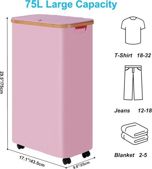 efluky Slim Laundry Basket with Wheels, Narrow Rolling Laundry Hamper with Lid and Removable Bag, Tall Aesthetic Dirty Clothes Hamper on Wheels for Laundry Room, Bedroom, Dorm and Bathroom, 75L Pink